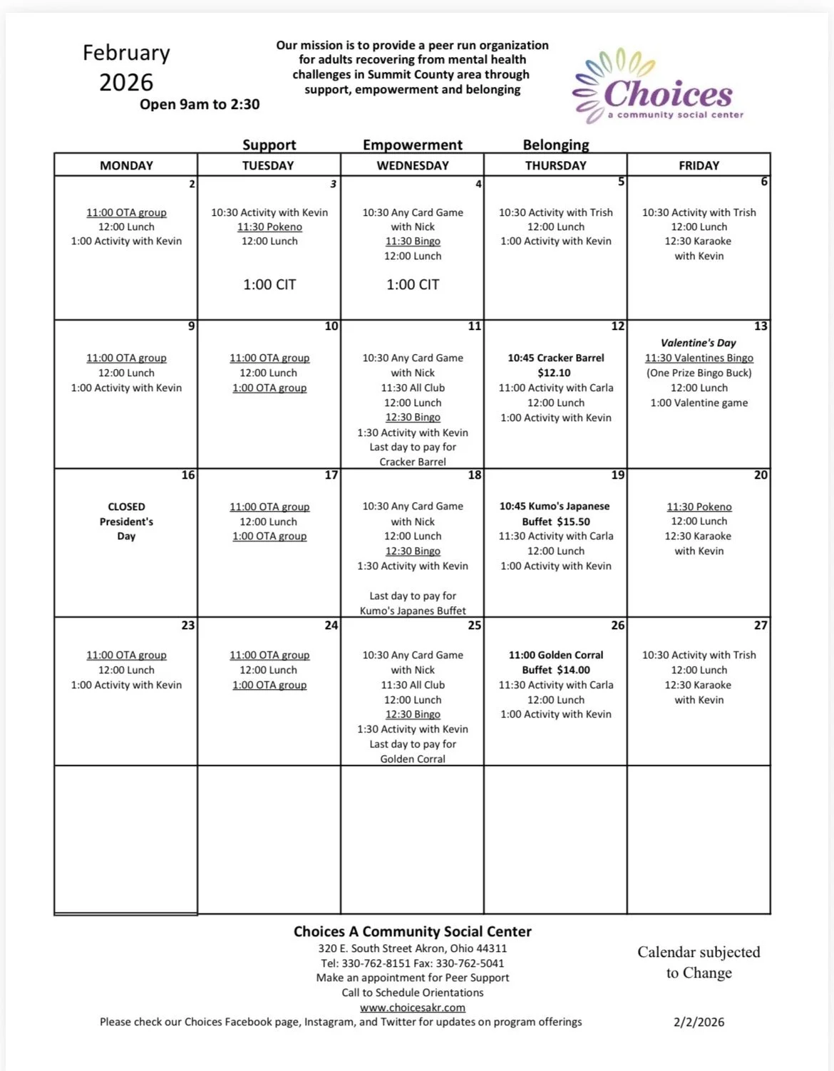 Choices Event Calendar for the week of 2/9/26-2/13/26